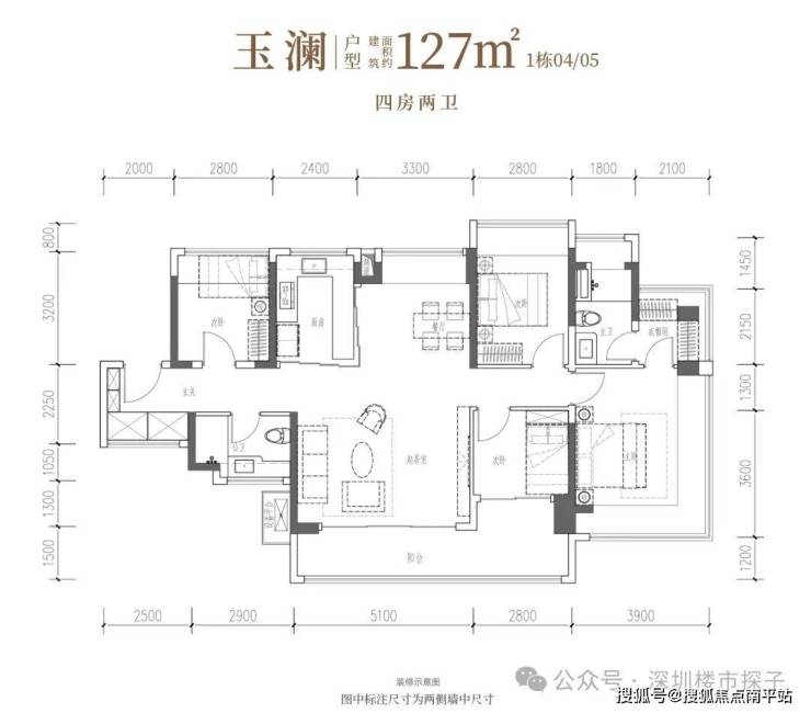 •玉澜·建面约127㎡4房2厅2卫:南向四开间,南北通透,约14.7米IMAX光幕,独立衣帽间