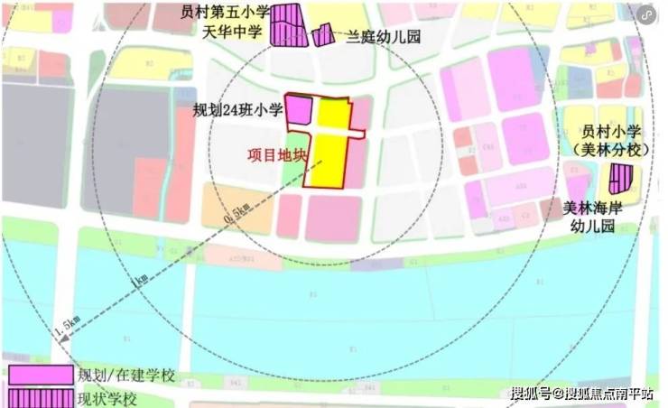 地块1.5公里范围内有员村第五小学、天华中学、兰庭幼儿园、员村小学(美林分校)、美林海岸幼儿园等。