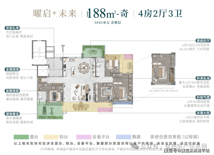 这次曝光的户型,才是真正的重头戏。项目主打建面约129㎡、143㎡和188㎡三个面积段,全部都是“第四代住宅”设计,每家每户都有巨大的空中露台或庭院。