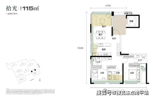 建面约115平的边套三房:分布在1号楼端头边户,3个卧室朝南,餐客厅一体全景舱设计,带独立电梯前室。