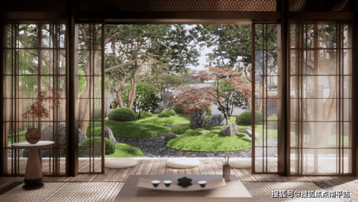 假山叠水,流水的动态之美与静态景观相互映衬;大面积白砂,精致景石以及枯山水置景打造,以极简手法重构传统禅意,让空间从喧嚣中抽离,营造 “静绝尘缘” 的禅意氛围。