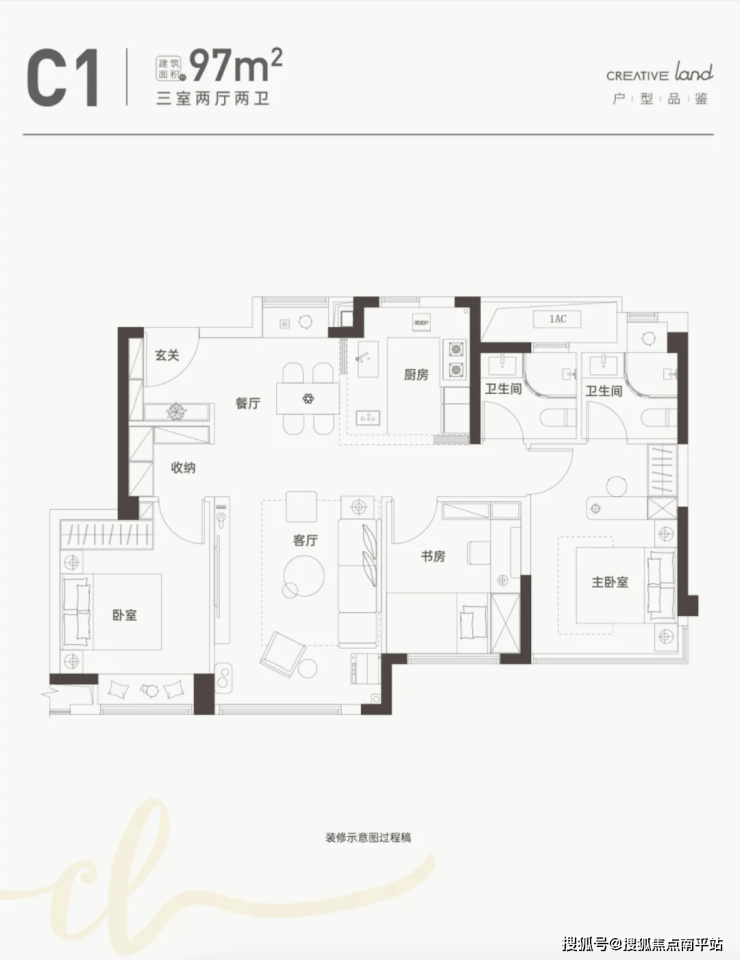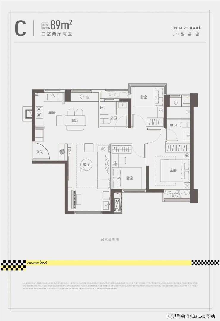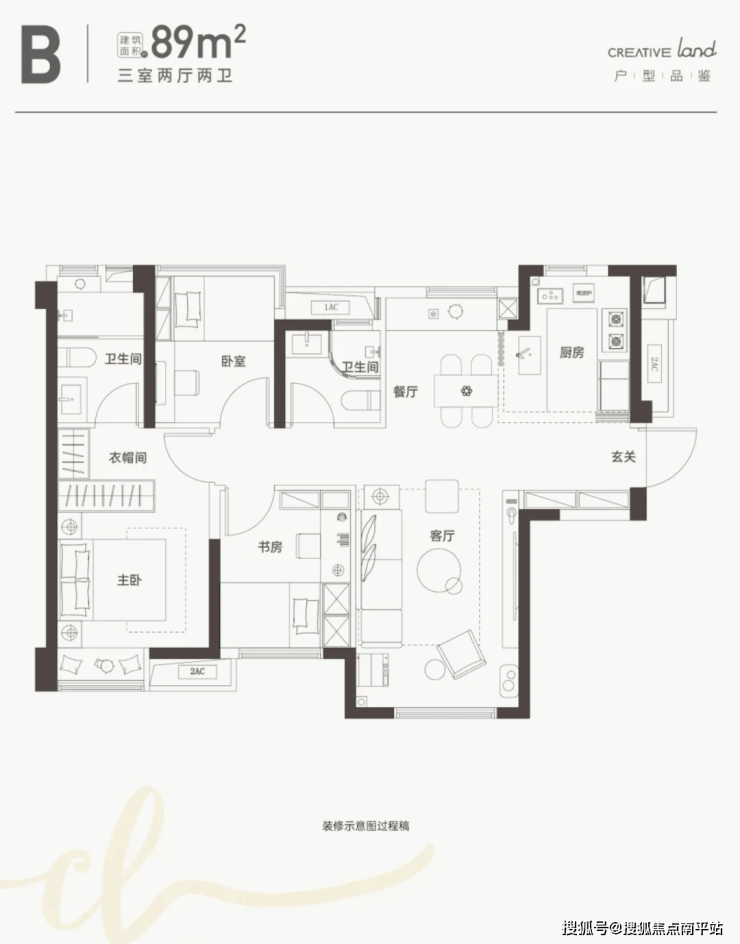 C户型:建面约89㎡,三室两厅两卫