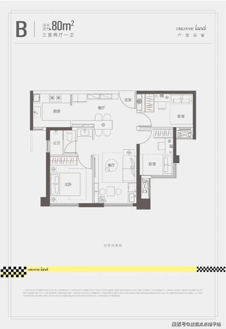 B户型:建面约80㎡,三室两厅一卫