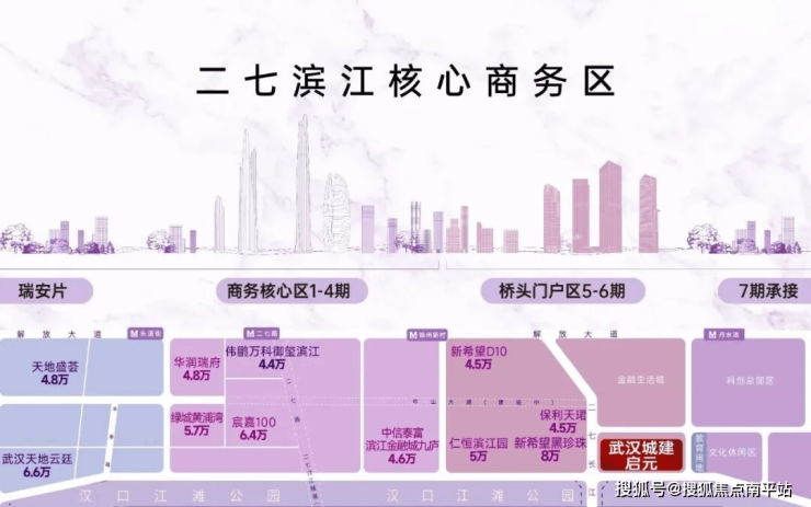 二七滨江商务区分7期开发,1-4期商务核心区由SOM、AECOM、NIKKEN、CBRE等统一规划;5-6期桥头总部门户区由ASGG、CBRE等统一规划;未来7期承接金融商务区与长江新区