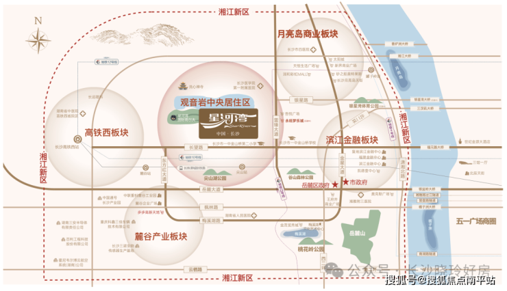 坐拥湘江新区中心地段,资源尽享。长沙市府、滨江CBD、麓谷、高铁西环绕,众星拱月发展势头不可阻挡。项目所在的观音湖板块处于湘江新区5大板块中心,唯一一个纯粹的、有着豪宅基因的宜居板块。