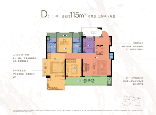 而建面约115㎡户型尺度则进一步拓宽,约5.25米大横厅,能承载的生活场景更多、更丰富。约8.25米全景双联阳台,让室内空间得以进一步扩大。
