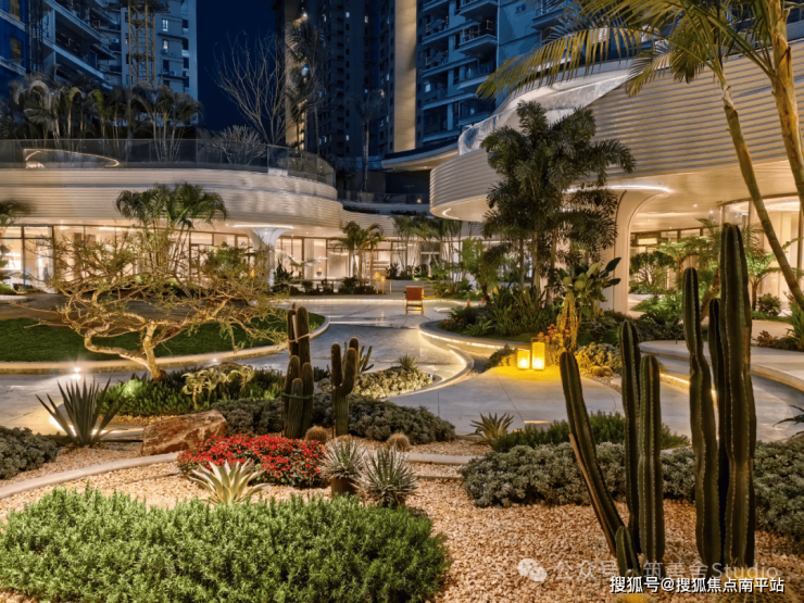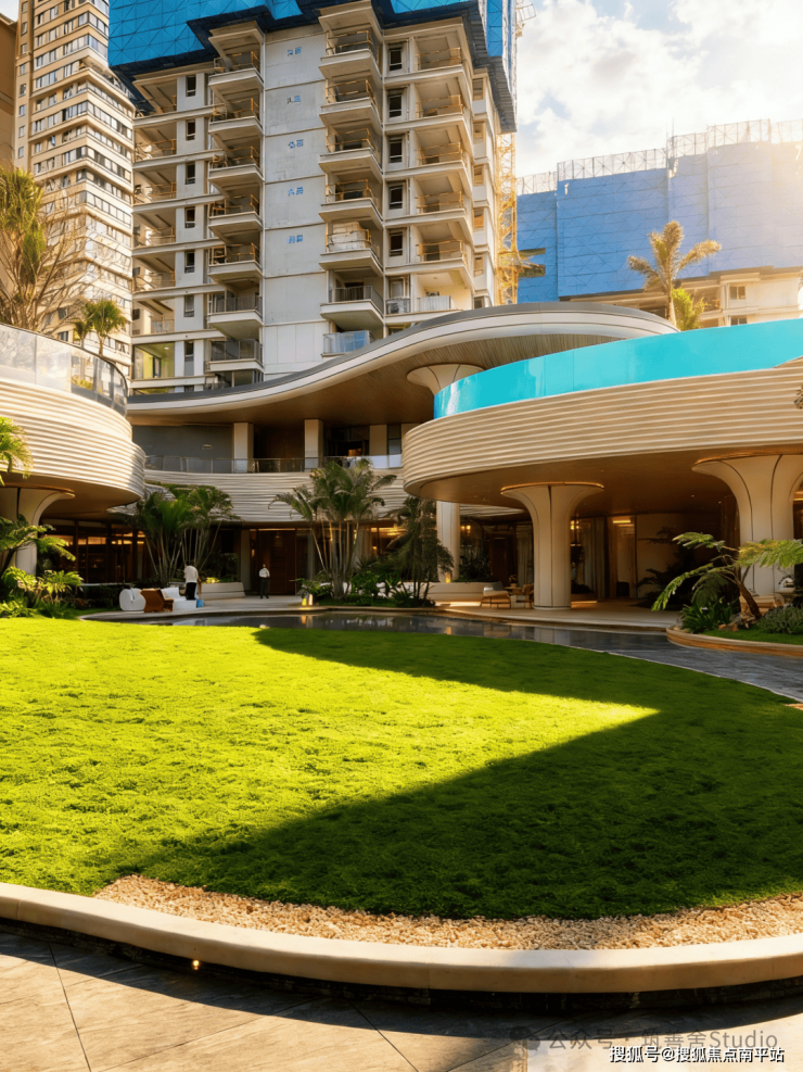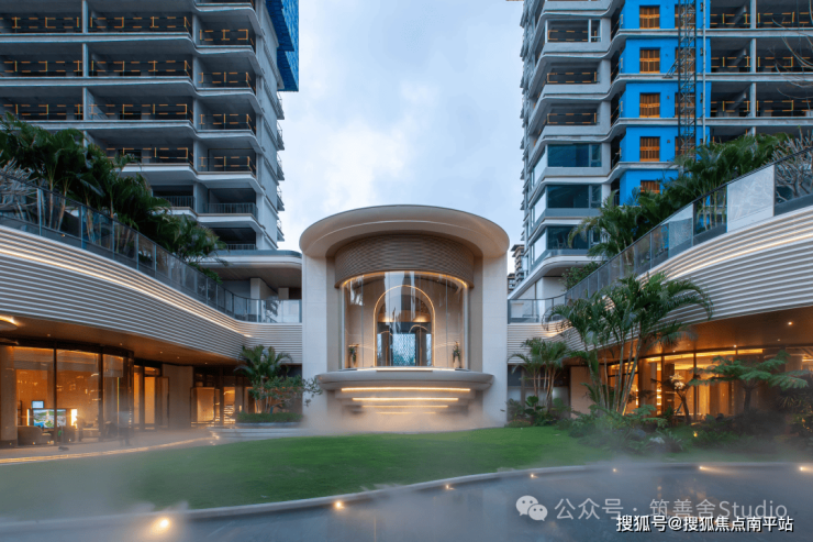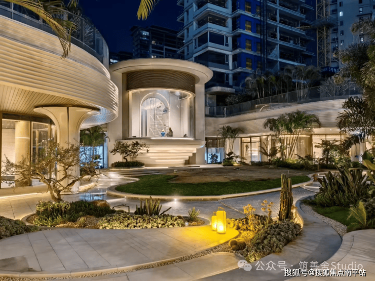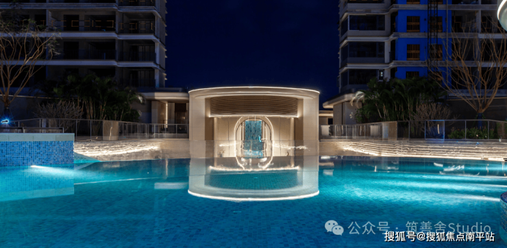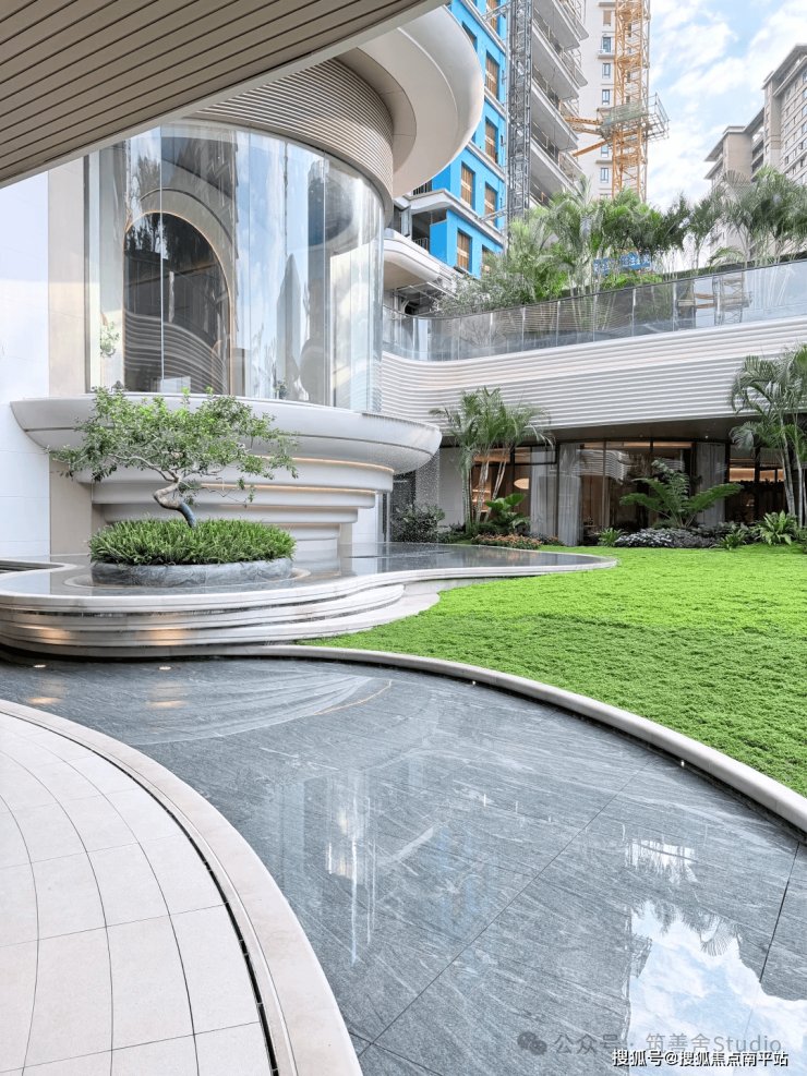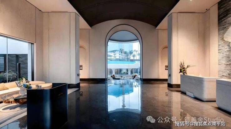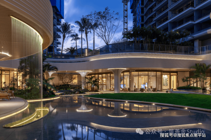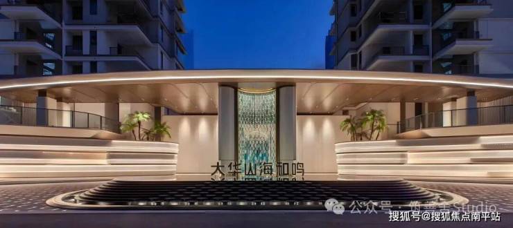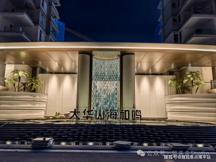 社区主入口宽近40米,高约7.2米,以米白色为主基调,辅以灯光渲染,营造出满级度假高奢氛围。大门由水波纹石材、双曲定制铝板、高定琉璃组合而成,据说是华南地区首个琉璃照壁大门,总造价超百万,寓意吉祥福气,气派非凡。前庭空间借鉴高奢酒店设计,形成环岛落客的归家仪式感,落客地面选用安哥拉黑石材,并以一砖多肌理的精致拼花处理,细节尽显高级。海浪纹迎宾叠水采用迪拜皇家亚特兰蒂斯酒店同款“非洲进口安哥拉黑天然石材”铺陈,极具尊贵感。
