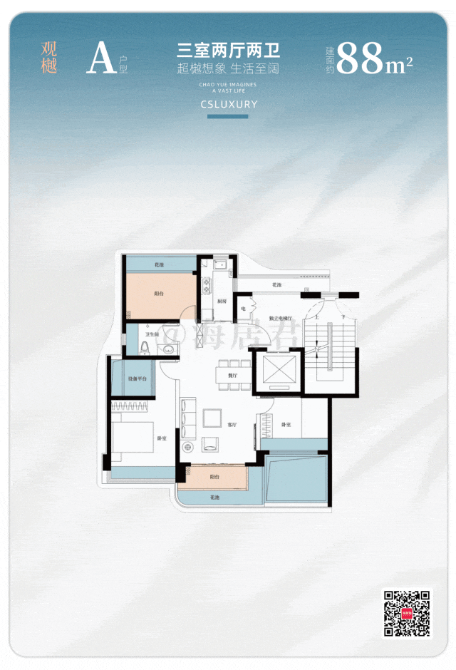 建面约 88 ㎡ 的 A 户型 就已经 突破性打造 出了 三房格局,以媲美竞品 111 ㎡的极致得房率,让每一寸空间都物超所值 。
