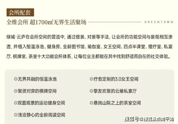 此外,打造 1700㎡全维会所,这是老豪宅完全没有的“加分项”——里面有“无界恒温泳池”、棋牌空间、阅读空间,甚至还有“疗愈室”“瑜伽室”,覆盖全龄段需求,老人散步、孩子玩耍、年轻人运动,都能各得其乐。