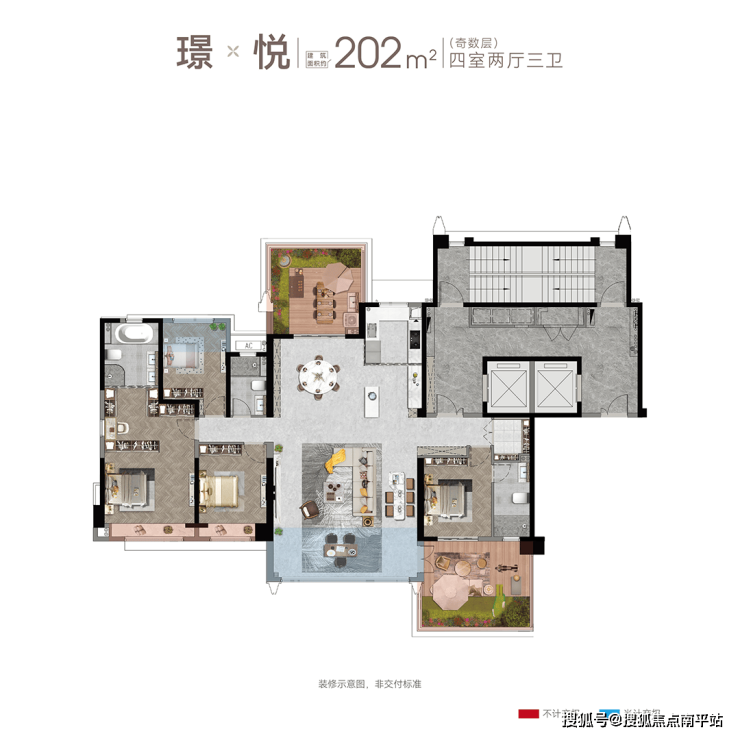 以 建面约163㎡奇数层户型为例,LDKX-Y的先进性布局,打破了室内外空间的边界,让整体空间格局更加比例均衡,公区面积也得到尽致拉伸,最大可构建出约54㎡会所式家庭聚会场,真正实现建筑与环境、自然与室内生活间的高频互动。而 建面约202㎡户型甚至能带来近100㎡社交场域,实现超高的公区升维,为居家生活打开更多可能性。
