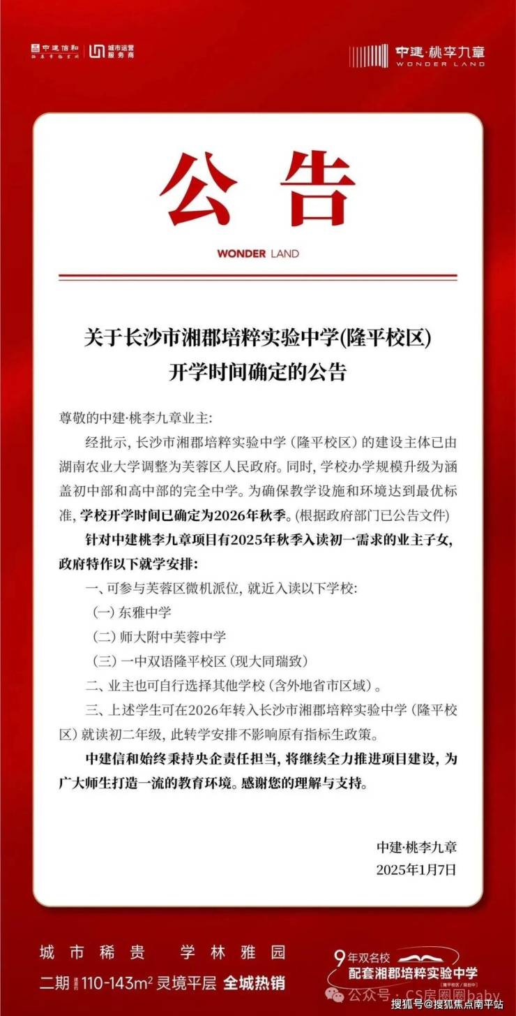 中建桃李九章项目配套入读湘郡培粹实验中学一校两址隆平小区(规划中),是芙蓉区唯一9年双名校配套入读项目