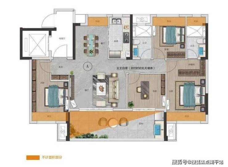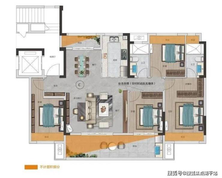 但还有一个加分项是,它户型设计的是起步四房,更改善更纯粹。