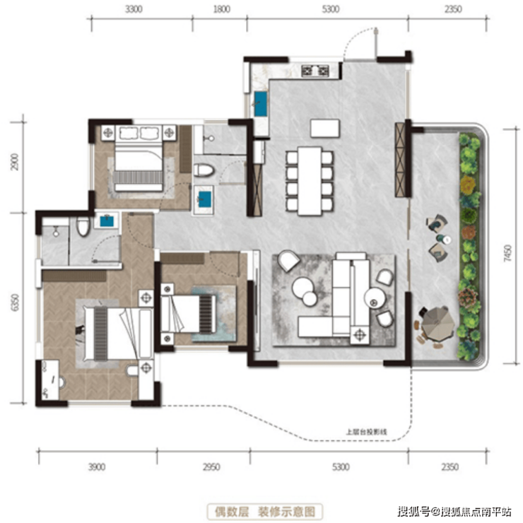 6米挑高空中花园 :不是简单的阳台放大,而是可种植、可DIY场景的立体生活空间。通过70-80公分视线遮挡板,解决上下楼对视的隐私问题