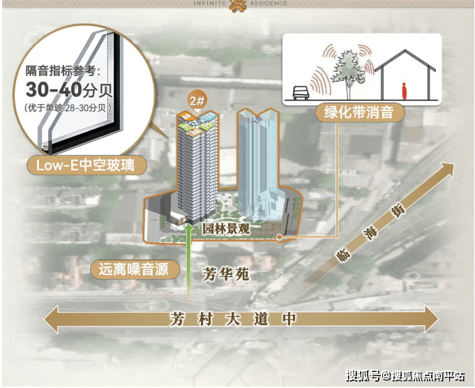 2栋靠近蓬莱花园,南向芳华苑阻隔主干道噪音,加上LOW-E隔音玻璃跟绿化带缓冲,更为静谧,私密性和居住感都更强。