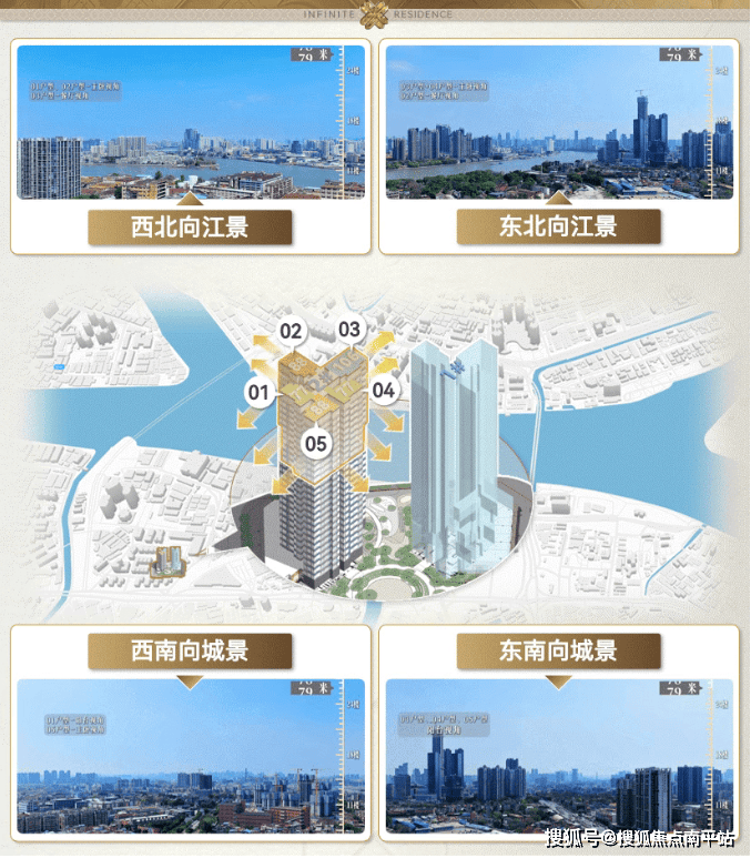 高区单位,西南向/东南向是繁华城景,东北/西北向望白鹅潭三江汇聚,视野更开阔。