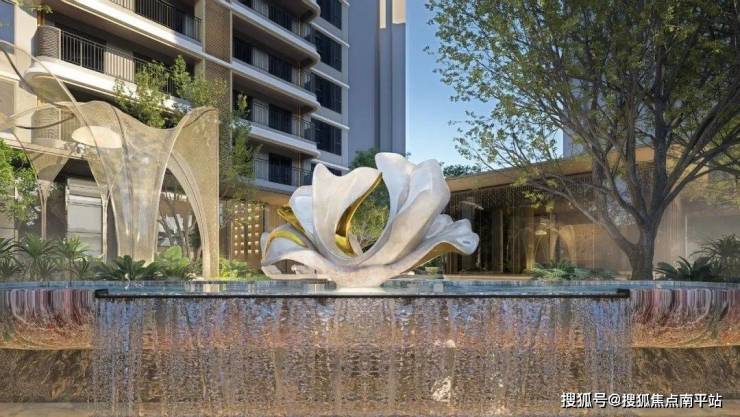 推开大门,便是无界水境中央水景,采用巴西进口铂金钻奢石与柬埔寨进口四季粉绿大理石,搭配凤凰花艺术雕塑,延续了项目的奢雅质感。