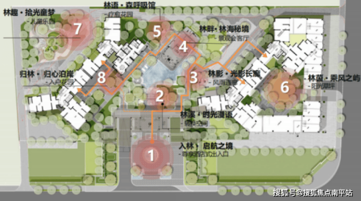 规划8大景观节点,涵盖悬浮会客厅、无界水境、疗愈花园、拾光童梦等多功能全龄生活场域,让老人、孩子、年轻人都能找到属于自己的角落。