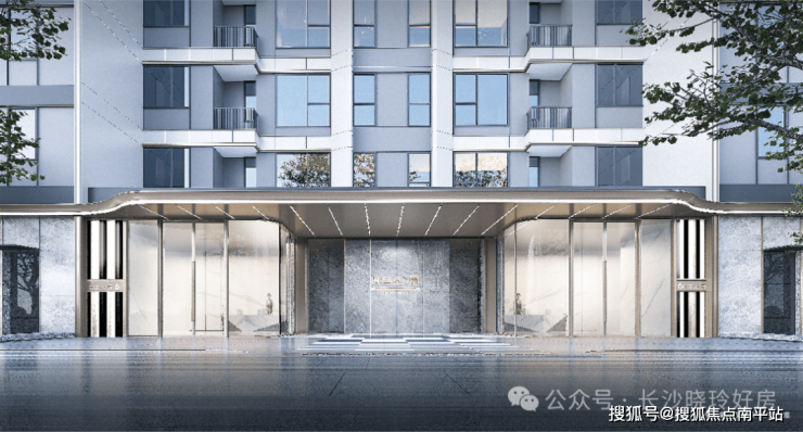 公建风立面:取简约冷色调,顶部采用折扇穿孔板造型,标准段铺排大面积流光玻璃,更以金属线条、铝板雕琢细节,如水晶般闪耀云端,尽展大宅气场