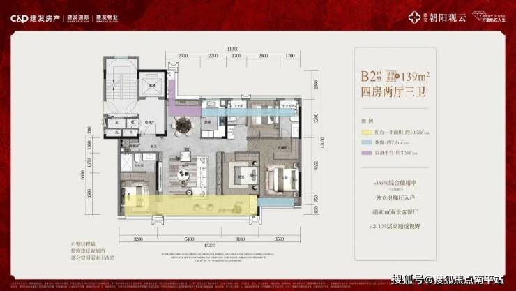 ◦ 139㎡大平层:(不含电梯厅)最高接近100%的综合使用率,层高约3.1米,正4房3套卧,独立电梯厅入户,约40㎡双景客餐厅+约8.5米宽阳台+5.4米大客厅,通透实用;