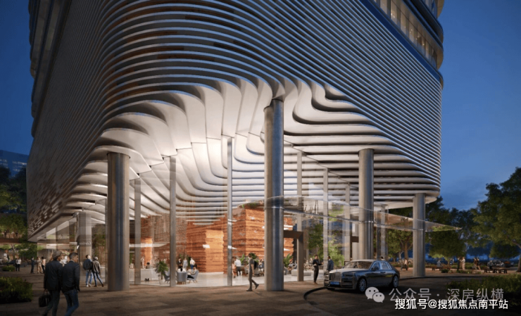 建筑立面以“现代极简”为基调,融入深圳滨海城市特质:柔和曲线造型如同风帆与海浪,与南侧深圳歌剧院呼应;基座则以“海浪拍打岩石”为灵感,采用多种砂岩质感石材,形成水平层叠线条,托起通透轻盈的塔楼,形成强烈质感对比。