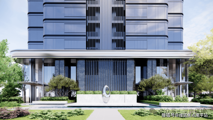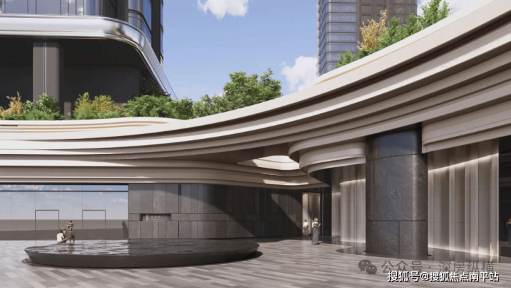 主大堂围绕中心下沉花园布局,搭配艺术环廊,打造兼具仪式感与放松感的归家体验。双大堂设计(步行仪式大堂 + 交通出行大堂),结合裙房入口悬挑一体化造型,打造高奢酒店式落客尊贵体验。