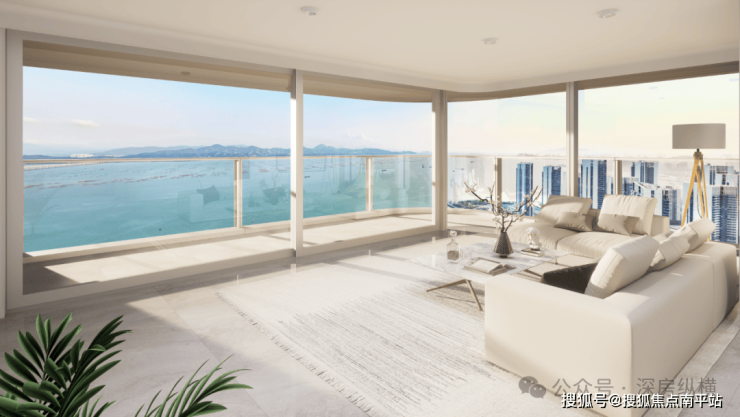 信悦湾主力户型客厅采用270°环幕无角柱设计,搭配弯弧玻璃、提升推拉门与大固定扇,将深圳湾大桥、歌剧院与城市繁华段全景引入室内,尽揽湾区美景。L形阳台则进一步延伸了观景界面,无遮挡直面海港景观。