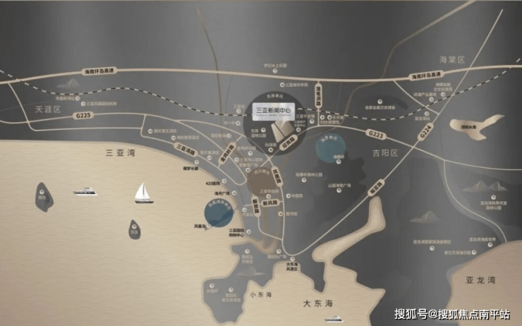 项目位于迎宾大道·东岸总部经济区,距三亚凤凰机场直线距离约11公里,距三亚高铁站直线距离约3公里,距海南环岛高速约4公里(荔枝沟互通),环拥优质医疗教育资源,自然景观丰富,各大醇熟商圈环绕。
