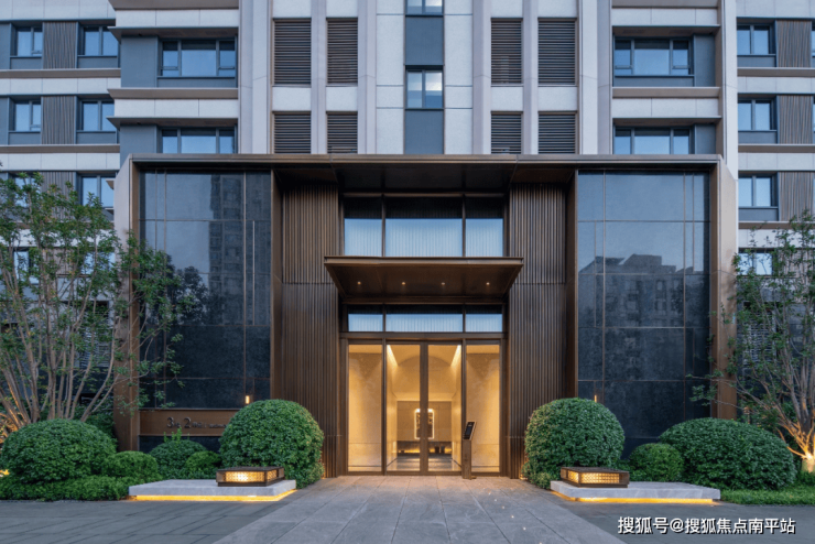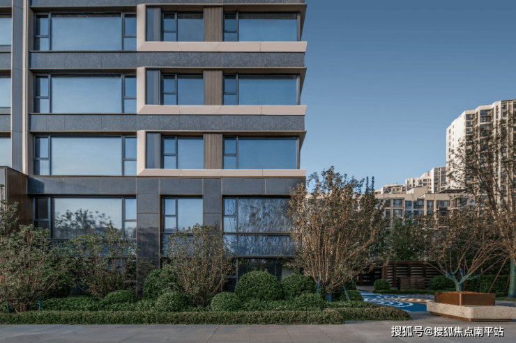 立面选材上采用高级的安哥拉黑和蓝钻搭配温暖内敛的木色铝板。项目对标上海璞丽酒店低饱和雅奢的配色,北京瑰丽酒店石材与木质材料运用,南京涵碧楼简约克制的风格,打造出项目独有的低调、隐奢的气质。更加国际化,现代感,艺术化设计追求。以设计之名,构筑尊贵酒店式居住体验。