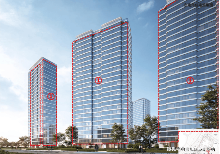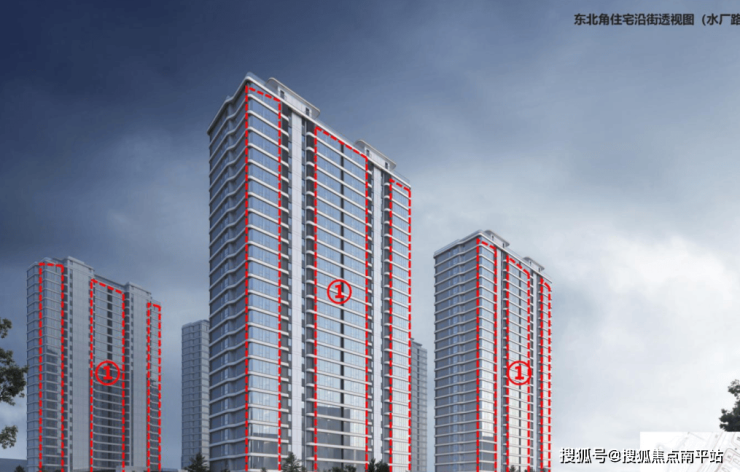 住宅楼南立面、东立面窗户分隔调整。主要中间均采用大玻璃封窗,形成更加大气的公建化立面(上图)。