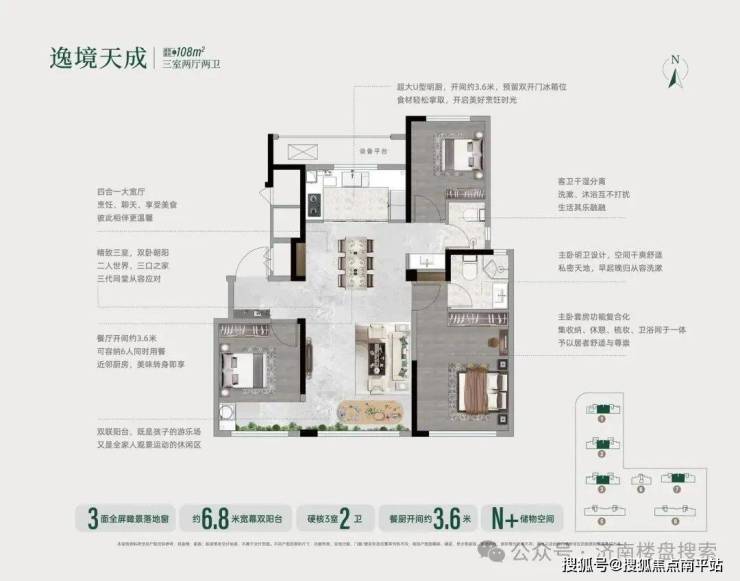 【108㎡三室两厅两卫】:分布在1/2/3/7号楼的中间户。四合一大宽厅,约6.8米宽幕双阳台,3面落地窗,餐厨开间约3.6米,主卧套房明卫。