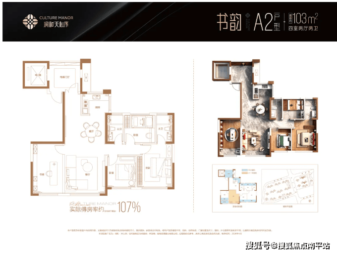 建面约103㎡四房两卫:得房率约107%,四开间朝南,100㎡左右面积段做到四房,全长沙罕见。