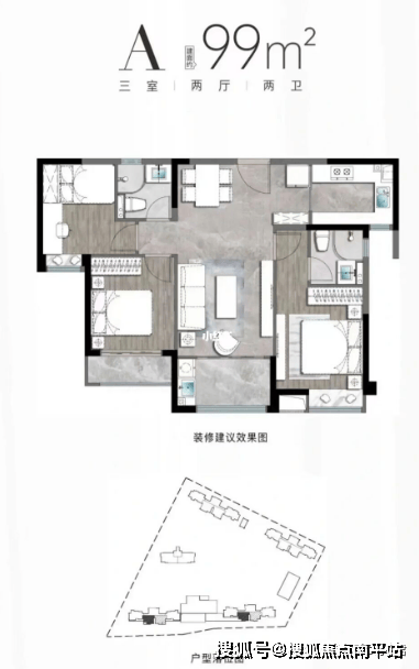 6、户型: 99㎡三房 ,这个户型整体没啥毛病,做到了最近开发商一直在宣传的“双阳台”, 如果价格合理应该是比较抢手,毕竟拉低了岛内的新房门槛,既能收一波岛内置换型客户也能吸附一波岛外大户型改善客户,在同板块3房的二手房竞争中也比较能打 。