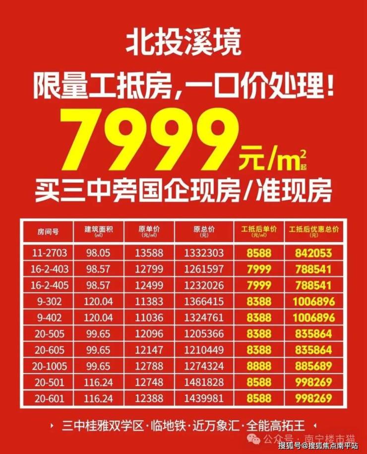北投溪境打着“工抵房”的名头放出一批房源,价格在7999~8588元/㎡,7999元/㎡的价格也刷新了该楼盘的历史低价。