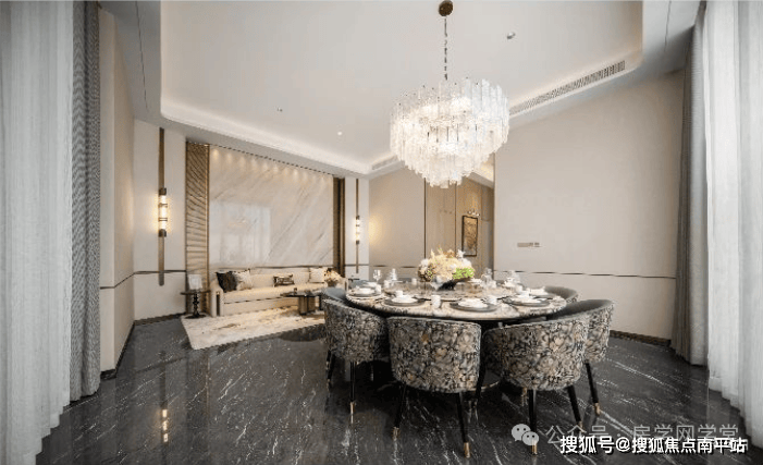 售楼处洽谈区天花取自闽南古厝传统建筑,以现代手法演绎典雅制式。“黑金美学”为空间增添大气优雅格调,高级黑金奢石,深黑底色象征着永恒的奢华,金色脉络镌刻出时光的鎏金璀璨。