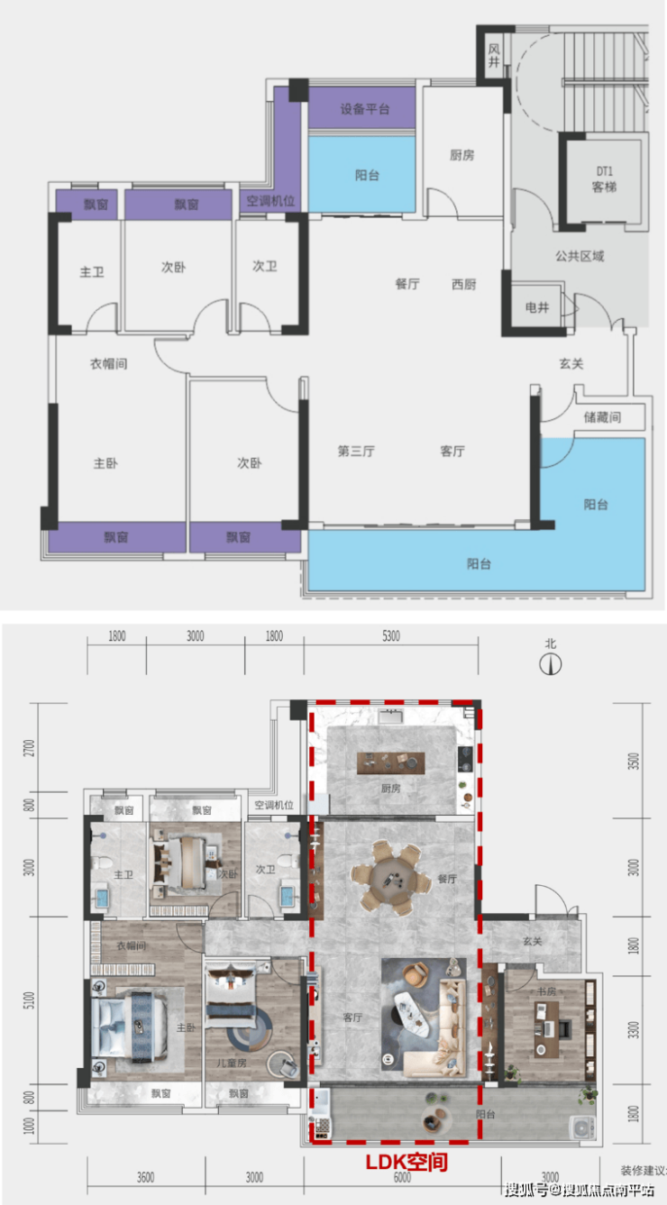 3、该户型开发商提供的改造思路与143㎡基本一致,都是将北侧厨房与赠送的阳台、设备平台统一改造为一个大厨房空间,这个户型的厨房空间更加夸张,面宽5.3米、进深3.5米,整个厨房的建筑面积大到19㎡,厨房这么大的操作台面,估计大部分家庭主妇都会嫌这么大的厨房操作起来太麻烦,很多家庭大概率会把北侧与厨房相邻的赠送空间单独做一个书房或茶室,做一个4+1户型。