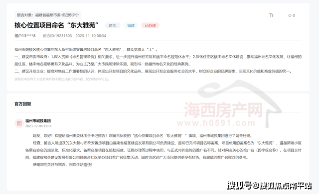 此前,福州宗地2023-29号备案名一度确定为“东大雅苑”。为此,有业主通过人民网领导留言板留言,觉得“东大雅苑”名字太土,建议深化住宅区楼宇地名文化建设,推动福州地名文化发展,让福州的居住区、楼宇地名能够更有文化品味,为业主乃至广大市民所津津乐道,能形成一批福州地名文化的经典案例