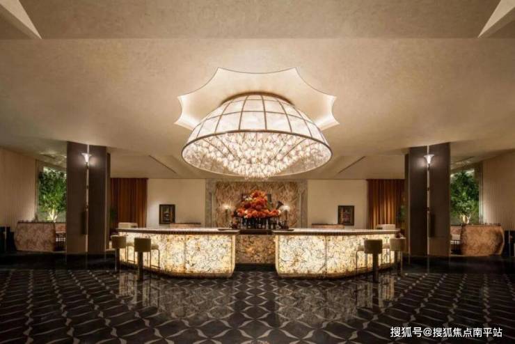 透过中空挂落,日光倾泻而入下方的“金石浮光”的艺术雕塑,阳光与金石肌理交织出细腻的纹理,低调奢华的氛围扑面而来。