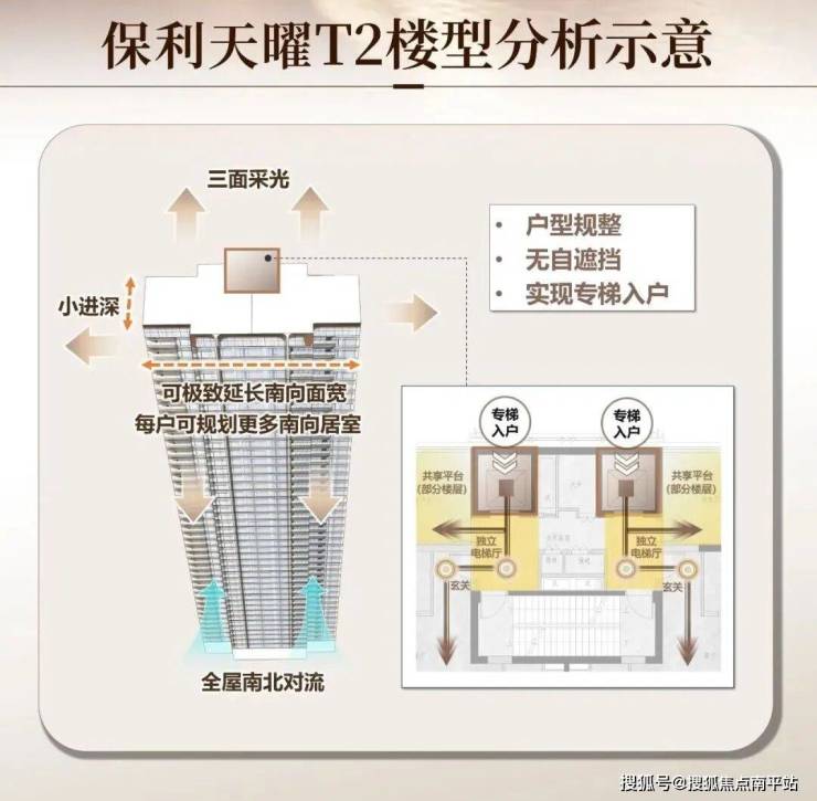 T2板式户型规整,通风强,互视少,可延伸南向大面宽,规划更多南向开间,实现专梯入户。