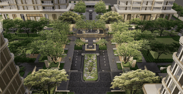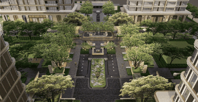 园林:项目是采用 " 一轴双园、三进五院 " 归家礼序,330 米长中轴园林