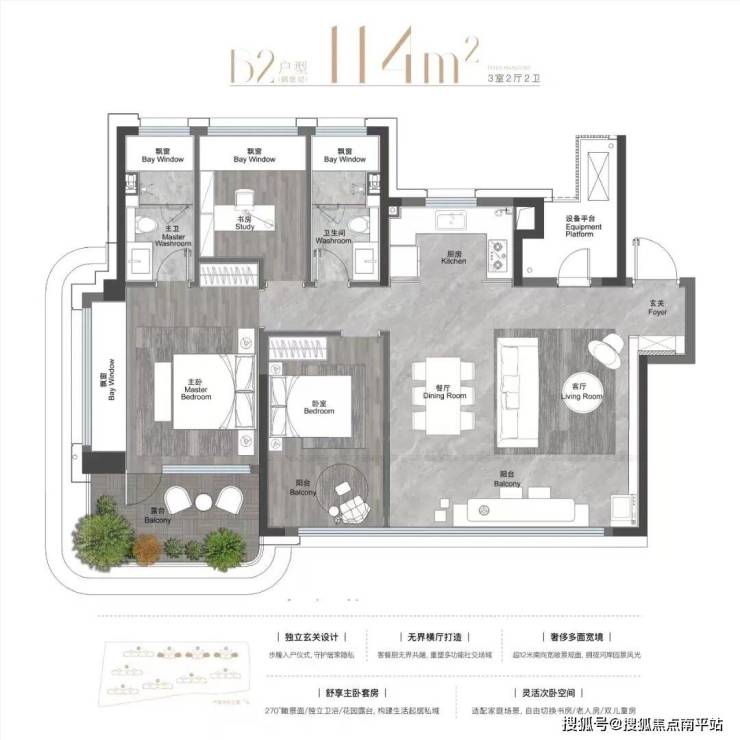 相较于102㎡的起步户型,114㎡“户型堪称是舒适型升级,延伸了更多功能空间:尤其是独立家政间,利用设备平台改造而成,实用性高。全飘窗设计,既提升景观视野面,又能将高附赠率顶格拉满。不少看房者直呼“太会了!”