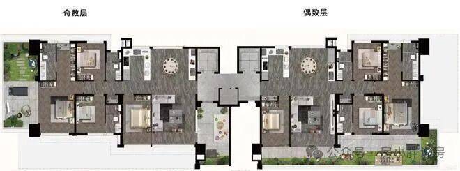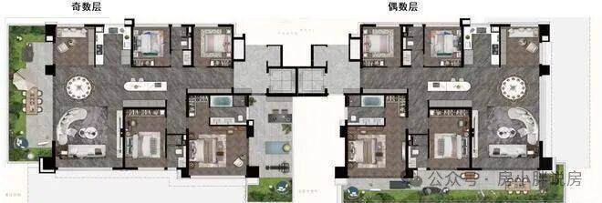 至于奇偶层的设计,与上面的户型完全一致,一个是南向长条的庭院,一个是分割的。