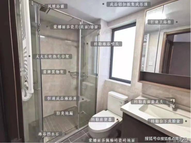 干湿分离,享受舒适沐浴阳光,科勒卫浴、镜前柜收纳空间,三雄极光浴霸,冬天也能温暖如春,电热毛巾架,除菌祛湿呵护健康。