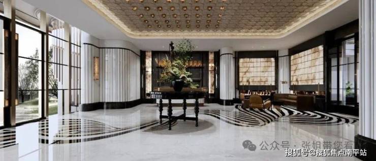 首层公区大堂搭配丝绒漆、古铜金属、深色岩板、锈镜、浅色石材、深色石材、金属踢脚等,保持风格高度统一。