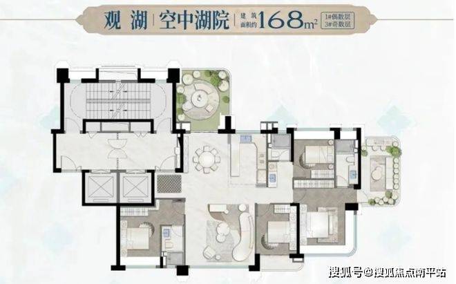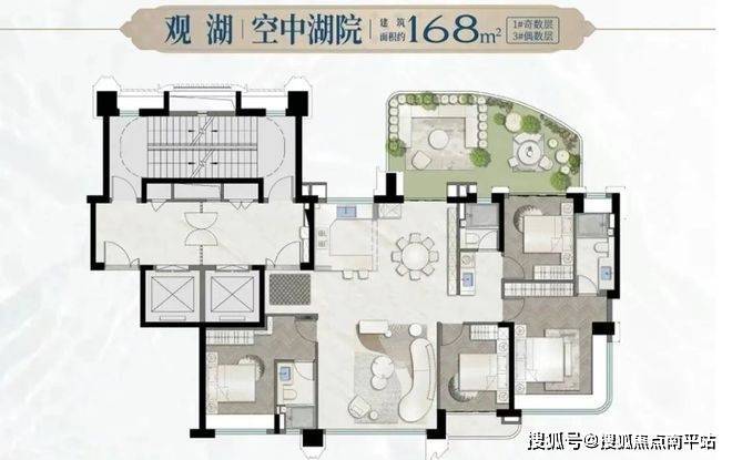 168㎡产品分布于3#楼的西端和1#楼的东端,相对来说景观资源比179㎡户型稍逊一筹,奇偶层的露台位置交错,差异不大,喜欢大露台的可以选右边户型,追求主卧舒适性的选左边户型。
