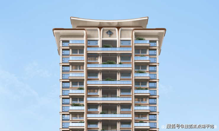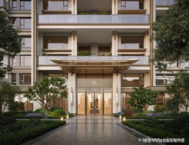立面上跳出了传统新中式的框架,取“空谷幽兰”的极简线条,赋予建筑轻盈的竖向延伸感;融“山水行舟”的错落层次,形成舒展的横向韵律。材质上,皇室咖石材的厚重、贝金米黄石材的温润、香槟金铝板的现代感,三种质感叠加,呈现出刚柔并济的视觉效果。这样的立面,在众多建筑中辨识度极高,更具备穿越周期的保值能力。