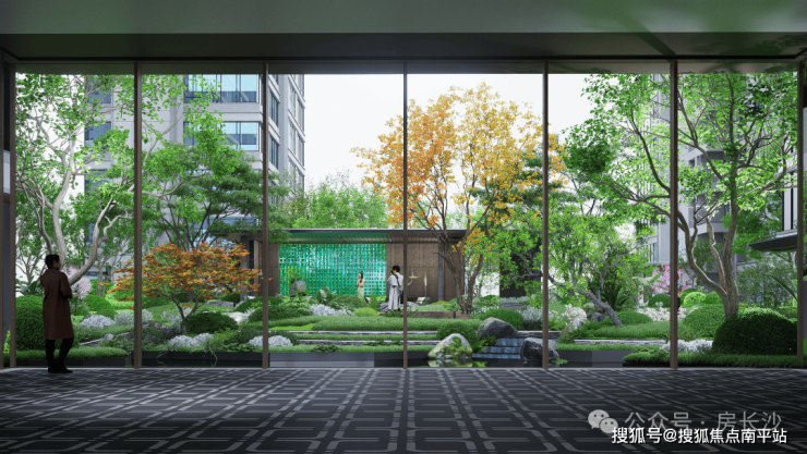采用 奢石、金属格栅 等质感材料,搭配 定制摩登地花与艺术装置 ,无边界设计打破建筑与自然的隔阂。规划 “一心·两轴·九大生活场景” ,每一处园林细节皆精工雕琢。