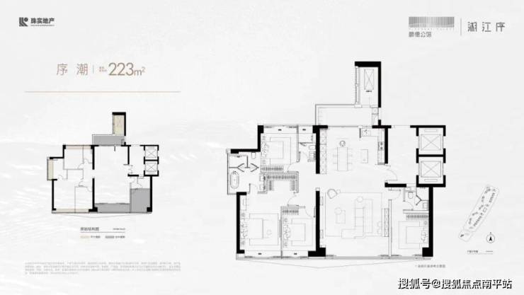 建筑面积约223㎡户型,辽阔总面宽、南向四开间、三面采光、主卧度假级套房、LDKB一体化设计等,雅契栋梁品位。