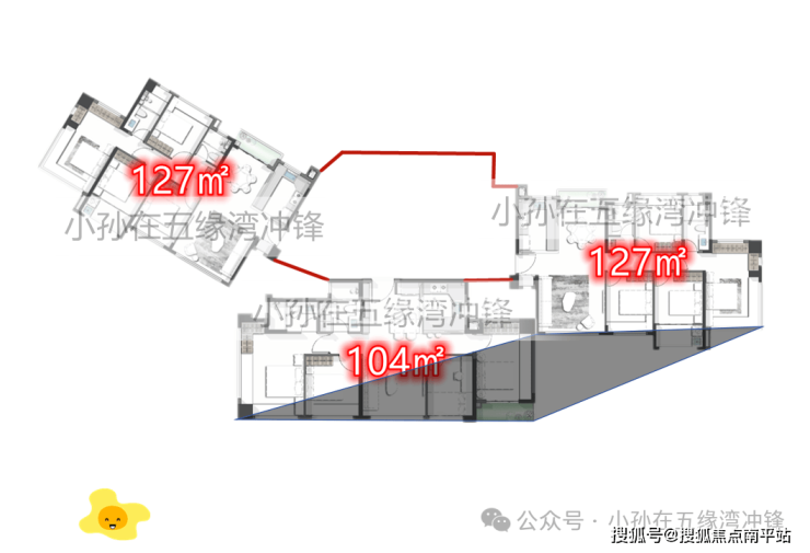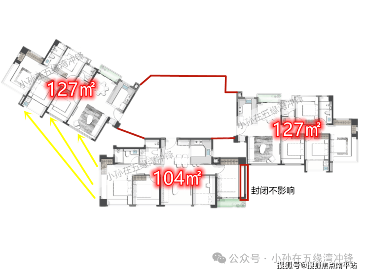 隐私问题倒是得到了一些解决,这次的104户型西面卧室的落地窗变成了墙,这样东侧的127或者139户型和前面的104户型之前就没有隐私性的问题(图?),但东侧房间是主卧,两面落地窗还是不可避免会有一些影响,不过这次楼栋的设计也有一些升级能减少这方面的担忧。