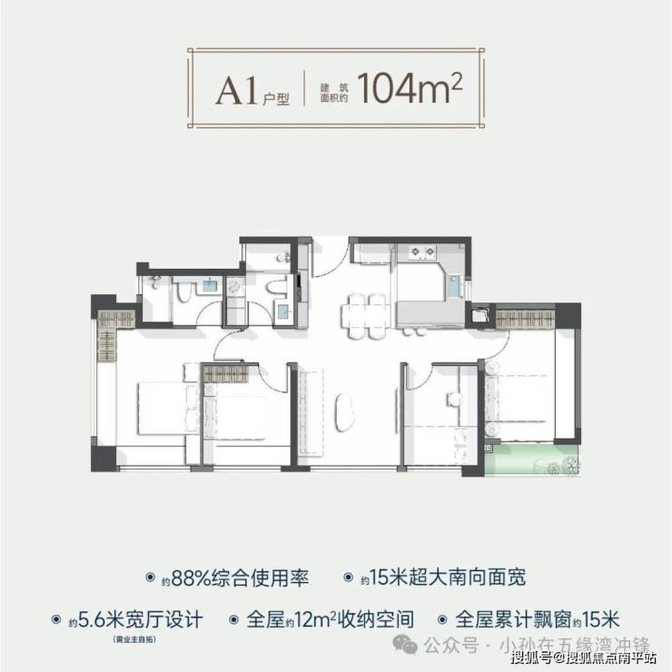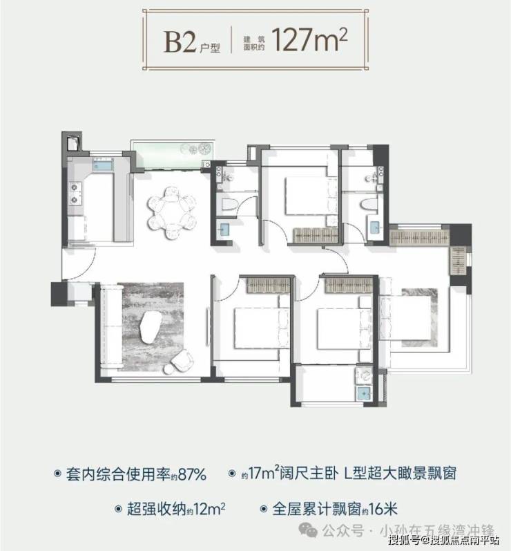 从户型格局方面来说这次的104-127-137这三种户型跟五缘鲤的99-123-136户型很像,可以理解成五缘鲤的升级版。跟五缘鲤一样,这次同样赠送飘窗和外阳台,但不同的是这次的飘窗是可以敲打的,而且交房的时候就会把飘窗敲完装修好交付到客户手中。104-110-127-137四种户型的得房率拉到了88%,143的得房率89%,170户型综合的放绿甚至超过了100%。如果说之前的产品还能因为无法敲打的飘窗给客户的内心造成一丝动摇,但现在可完全敲打赠送的飘窗真是实打实的优惠,香到爆,而且飘窗敲完的落地窗离地只有5厘米,采光和景观视野又进一步升级。你以为户型方面的升级到此结束了?还没有,这次在户型面宽方面又有进一步改进,104户型的面宽为15米四开间朝南,110为14米,(127以上的户型面宽还没公开),搭配上35-83米的楼间距采光都不会差。