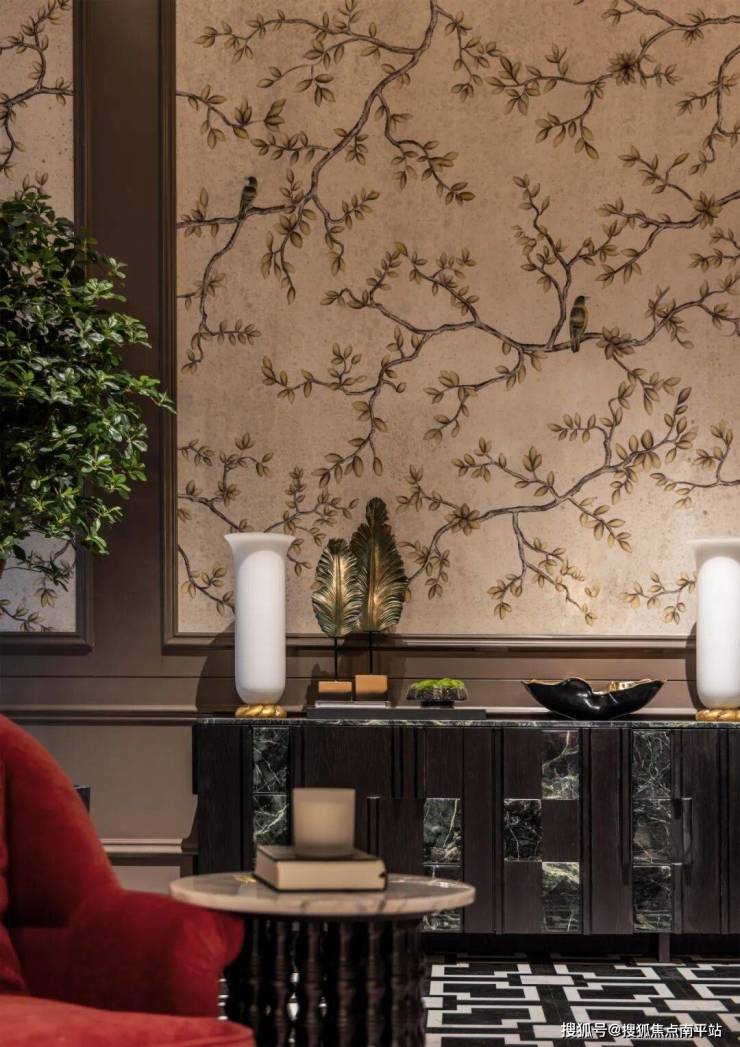 整体空间色调凝重高雅,瓷器、皮革和天然纤维,这些不同的材质带动空间的丰富性与趣味性,衬托出时尚、优雅、浪漫的生活品质。不同装饰感的饰品与水晶吊灯一起,展现出一场华丽的演变。
